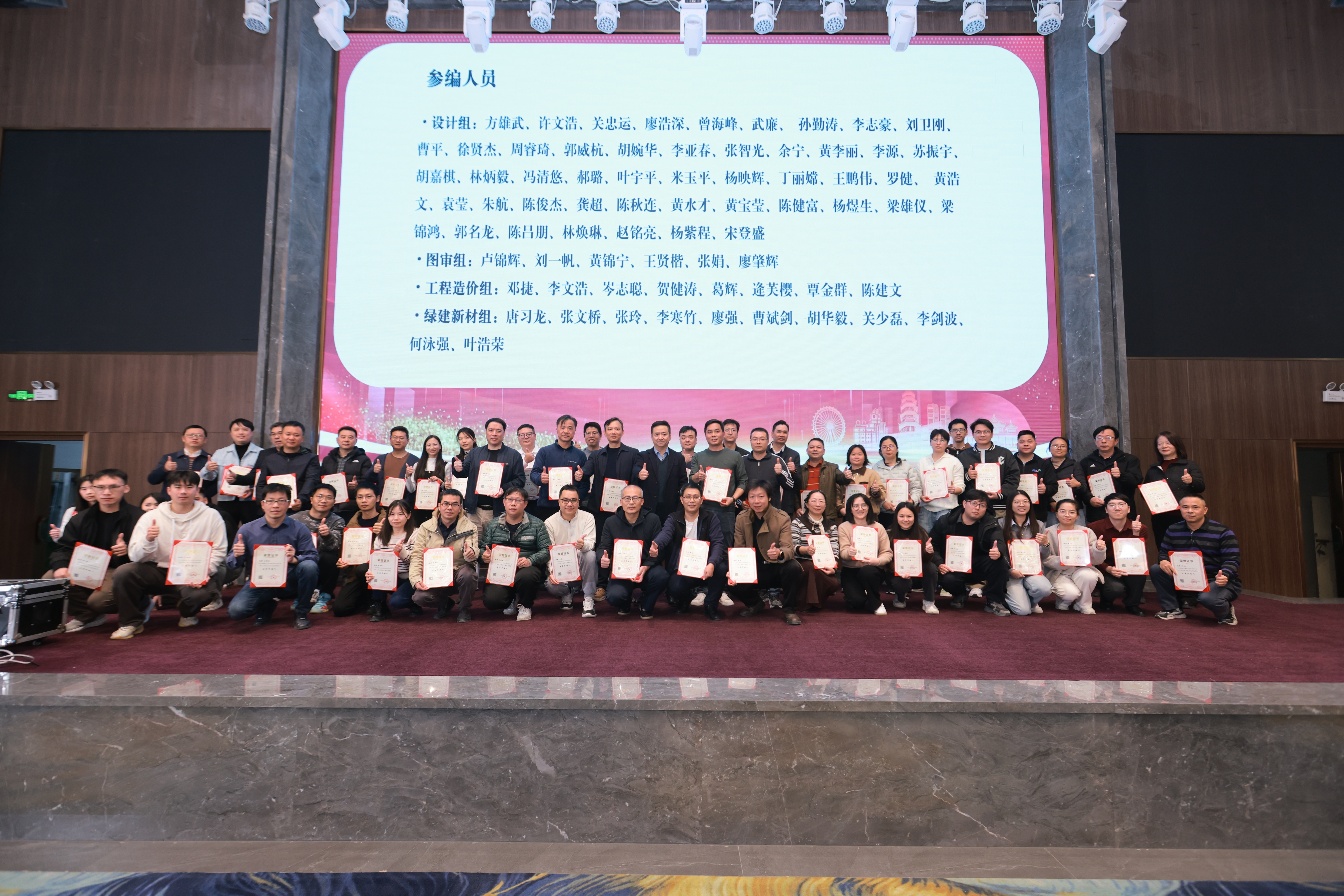 期间,王滔会长向《中山市农房设计通用图集》编制组的两位组长方雄武、许文浩颁发聘书,随后两位组长向来自16家参编单位的71名技术骨干逐一颁发了聘书。鲜红聘书映照着他们肩负的使命——用专业之笔描绘乡村振兴新画卷,以匠心设计筑就“百千万工程”新标杆。台下热烈的掌声,既是对技术专家团队的最高礼赞,更是对中山农房风貌蝶变的热切期许。